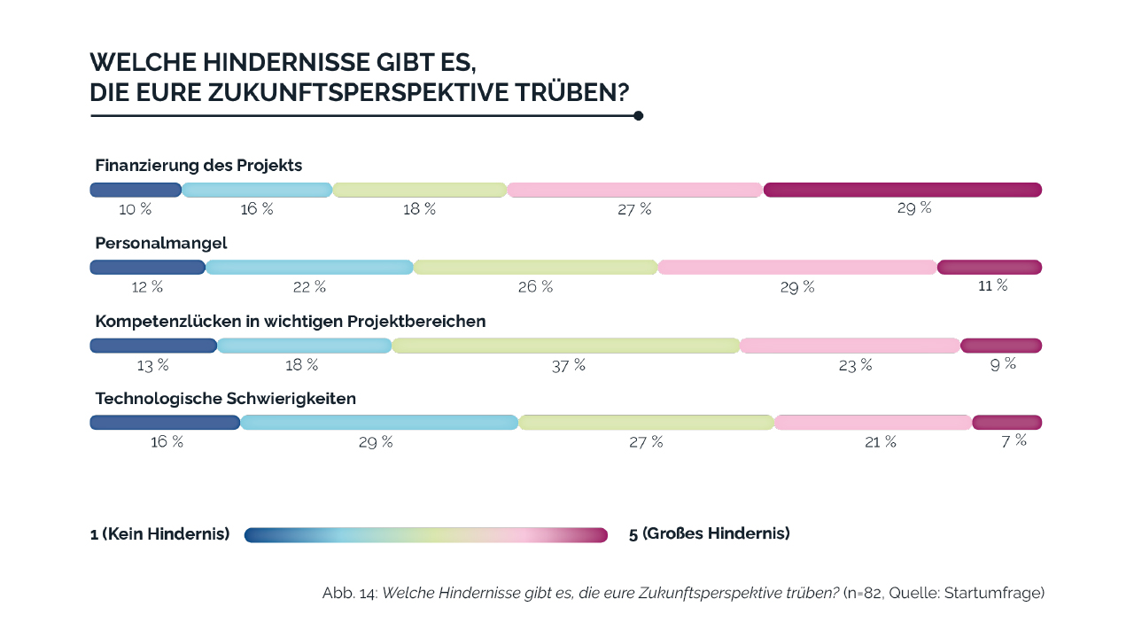 Ein Diagramm, das aufzeigt, was die größten Hürden für die Projektteams sind. An erster Stelle steht die Finanzierung des Projekts, an zweiter Stelle Personalmangel und an dritter Stelle Kompetenzlücken in wichtigen Projektbereichen.