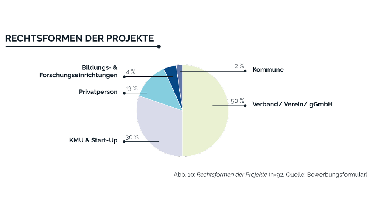Ein Kuchendiagramm, das die verschiedenen Rechtsformen der teilnehmenden Projekte aufzeigt. 2% der Projekte kommen aus Kommunen, 4% der Projekte stammen aus Bildungs- und Forschungseinrichtungen, 13% der Projekte werden Privatpersonen getragen, 30% der Projekte kommen aus KMUs und Start-Ups, 60% der Projekte stammen von Verbände, Vereine oder gGmbHs.